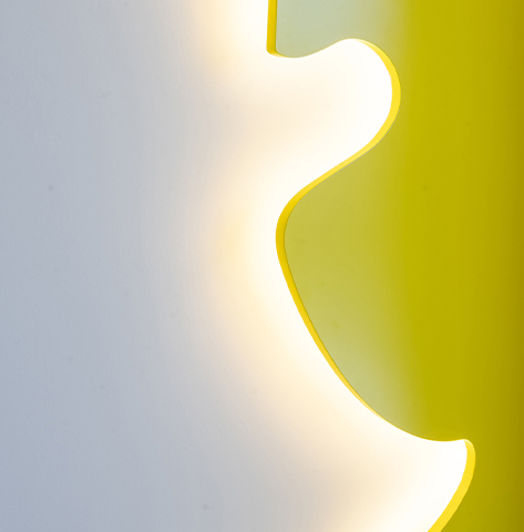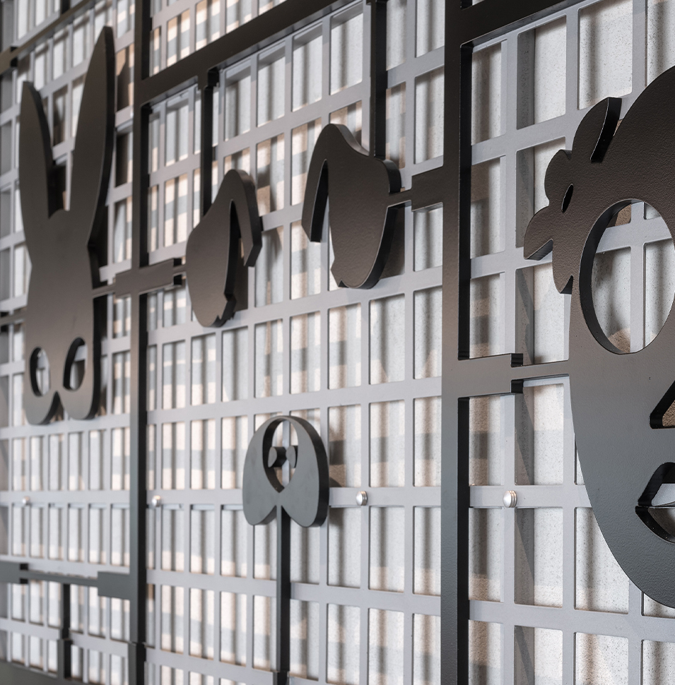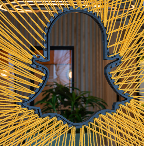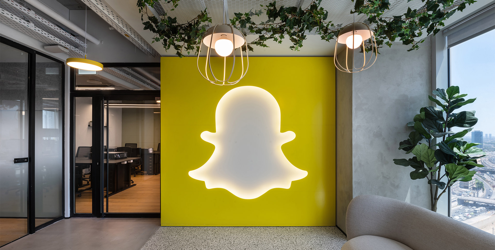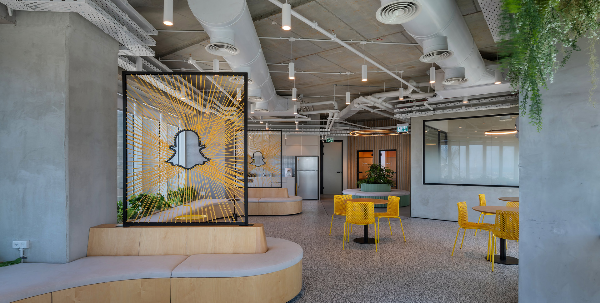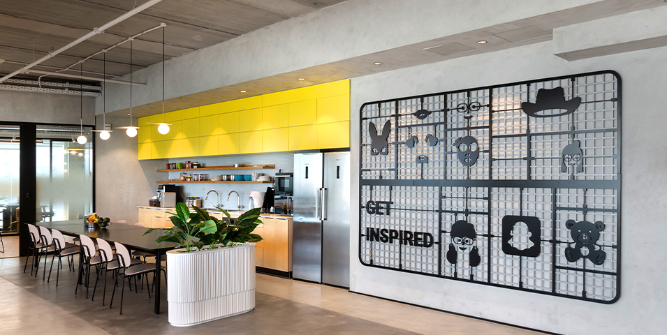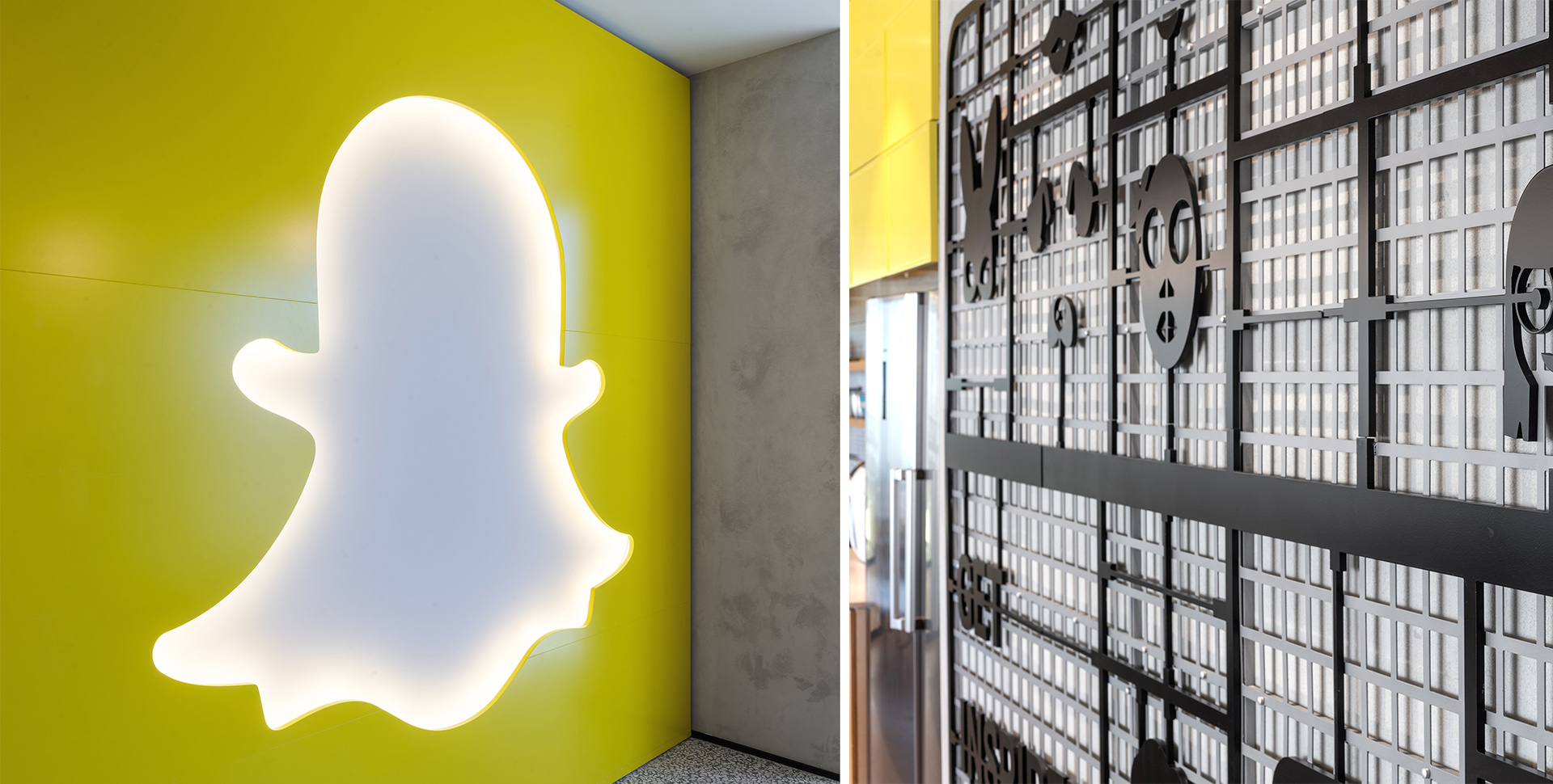 Snapchat offices wanted to create a cool design using unique materials that would speak the spirit of the brand. Each wall, was transformed into a work of art—using elements such as yarn interwoven on an aluminum partition, digital canvases and unique 3D CNC created lettering and signage.